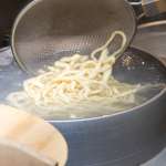 ▲平ざるで釜から取り出し、流水で一気に締める。「柔らかいうどんがいい場合、『あつやわ』にもできるので注文時にお伝えください」(店長の史 占豊さん)
