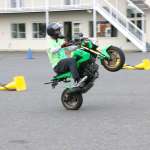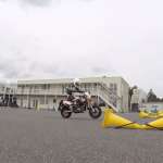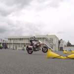 実際の練習はパイロンで仕切られたスペースで順番に行います。サーキット内なので舗装状態も良くて練習しやすい。ちなみに、一般の道路は水はけを良くするためにカマボコ状になっているため、フロントを上げてからバランスを崩しやすいのだとか。公道で練習するのがご法度なのはそういう理由もあるようです。