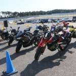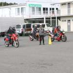 ただ、少しずつできるようになってきたタイミングで雨が降り出してしまいました…。とりあえず雨宿りをしながら、講師陣のアドバイスに耳を傾けます。幸いなことに割とすぐに止んだのですが、路面は完全にウェットに…。滑りやすいのでパワーがあるバイクなどではリスクが高くなってしまいますが、それでも皆さん練習を続けています。やる気がすごい。