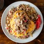 チャーハンの上にオムレツ。確かにこれはSNSウケするのも納得。もぉ見るからに美味しそうだもん。