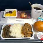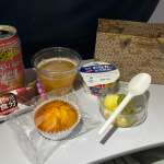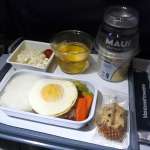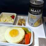 しばらくすると、スナックタイムに。ミニプリエッツェルとALOHA MAIDのパイナップルジュースをゴクゴク&ポリポリ。その後、1回目の機内食の提供がスタートしました。