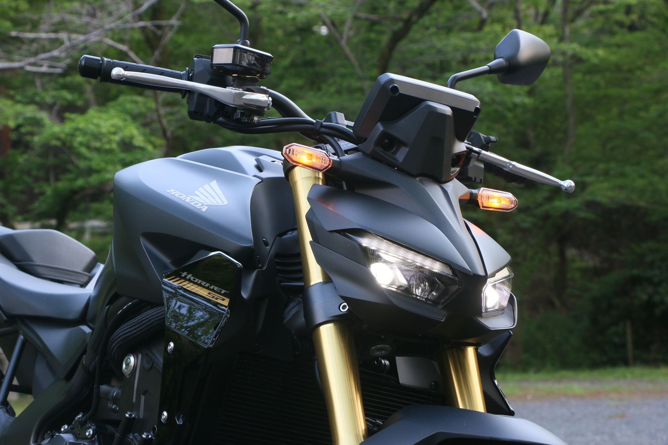 フロントの足回りはともにショーワ製のSFF-BP(セパレート・ファンクション・フロントフォーク・ビッグピストン)倒立フォークにラジアルマウントのブレーキキャリパーという組み合わせ。「CB1000ホーネットSP」については、フォークはフルアジャスタブルでブレーキはブレンボという高品質なセットになっています。