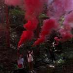 ヘリコプターやドローンの音が聞こえたらコンパクトな発煙筒「ポッケム」の出番。樹林帯でも赤い煙で位置を伝えやすくなるんですね。