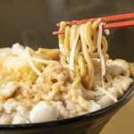 ▲背脂の下から極太麺を引っ張り出す! フタ効果で中は熱々。そしてもやしとチャーシューが出てきた!