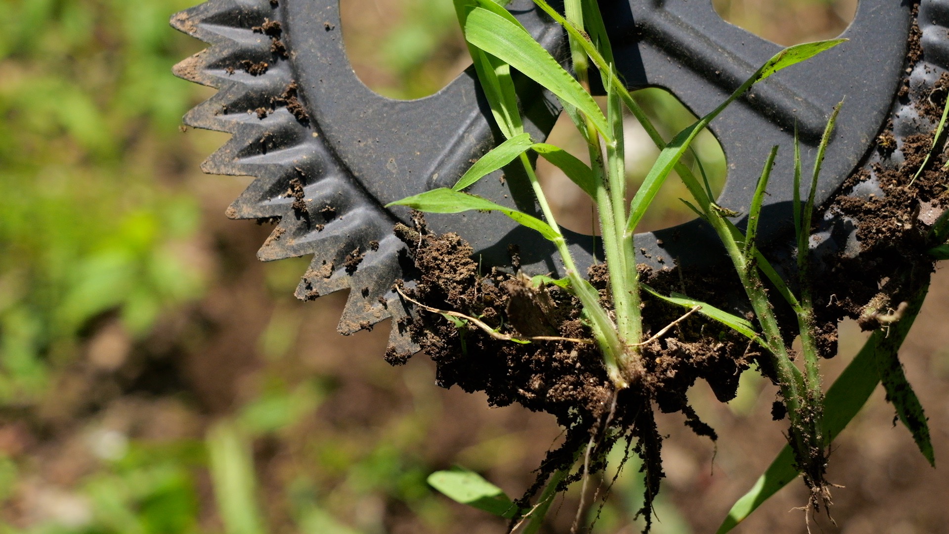 今回紹介するのは、匠作(しょうさく)の「ウェーブカッター」(実勢価格:2400円前後)。円盤状にトゲトゲがついたビジュアルは、どこかエンジン式の刈払機を思わせますが、刃はなし。回転もしません。なのに、なでるだけで雑草を刈れるというアイテム。