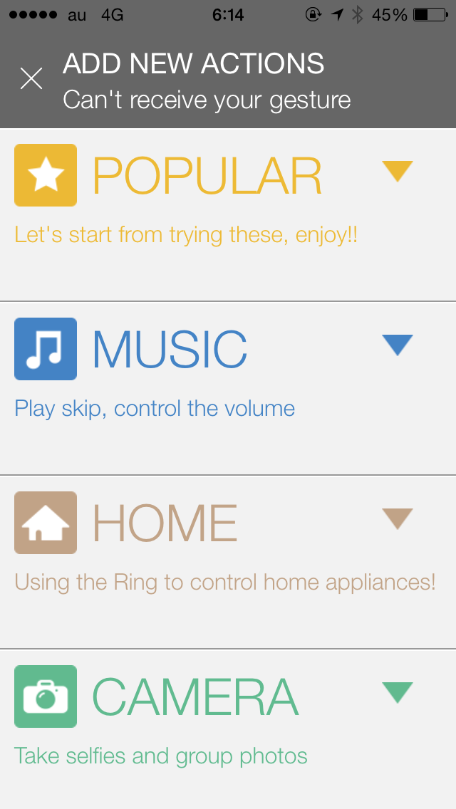 スマホを操作可能なジェスチャーは多彩。アプリの画面下部にある「Add New Action」を選び、「POPULAR」「MUSIC」「HOME」「CAMERA」「SOCIAL」「LIFE」「MESSAGE」「DEVELOPER」という8カテゴリからどんどん追加してみましょう。