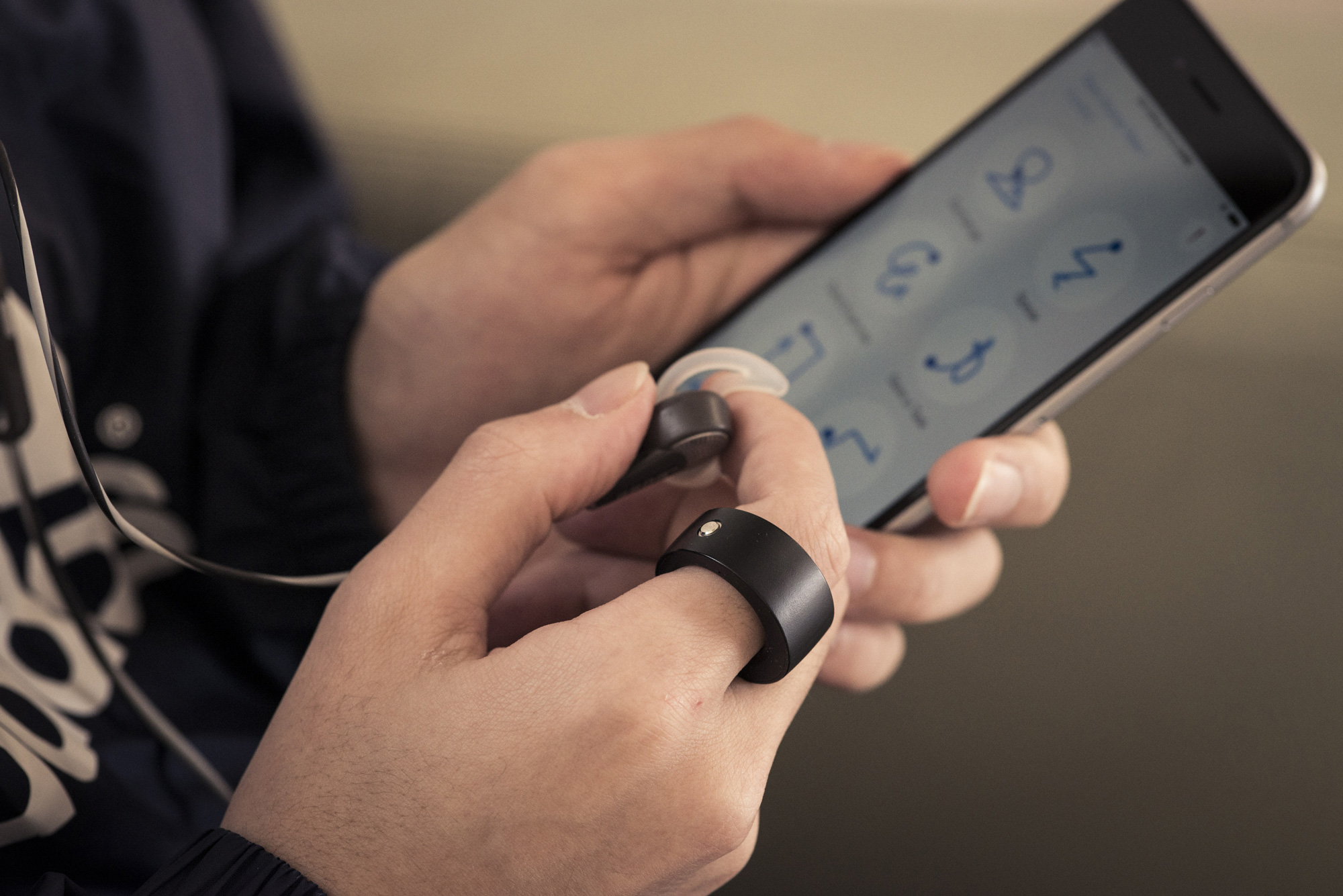 さて、この「Ring ZERO」のウリは“指一本でさまざまなものをコントロールできる”というもの。ほほう、そんなことができるんですか? とりあえずスマホを操作してみよう。