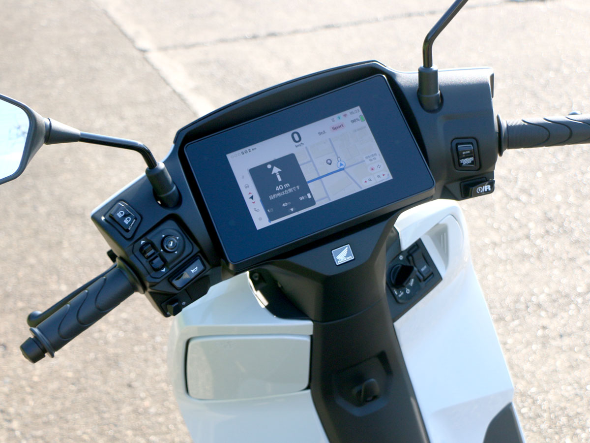 「CUV e:」の定格出力は0.98kWで最高出力は6.0kW(8.2PS)。原付二種らしく十分なパワーがあり、最高速度は83km/hとアナウンスされています。バッテリーは交換式の「ホンダモバイルパワーパックe:」を2個搭載。航続距離は60km/h一定走行(国土交通省届出値)で57km、欧州届出値であるWMTCクラス1では72km走行後、最高速度を抑えることで79.8km走行できるとのことです。