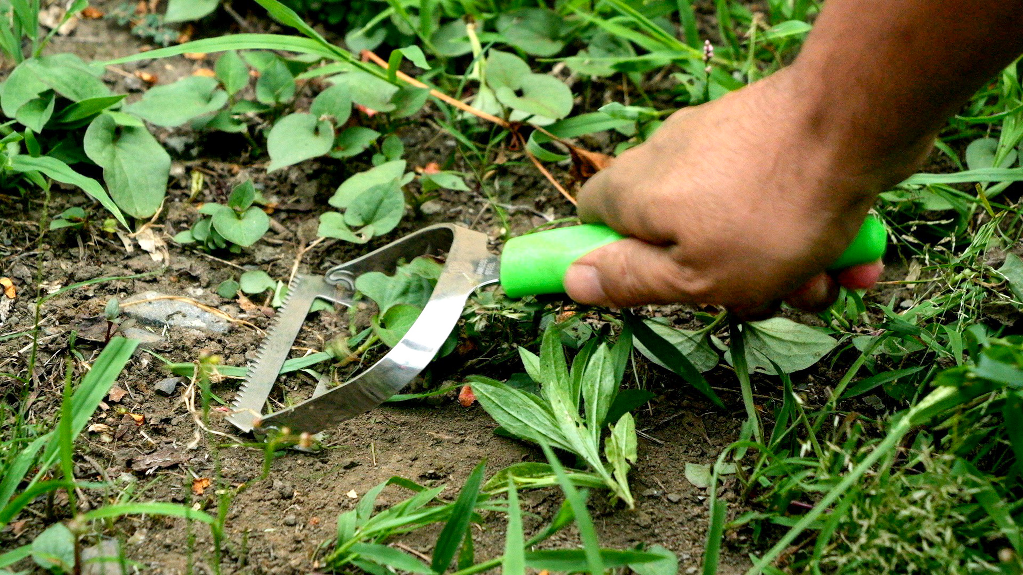 刃を地面にピタッと当てて、しっかり握った手でそのまま手前に引くだけ。まるで野菜の皮をむくような感覚で、雑草を根元からこそげ落とすことができます。