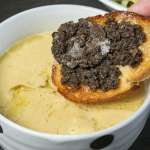 そして、中盤にきたらいよいよトリュフバゲット。上にのっているトリュフがこぼれないよう、そっとバゲットをつけ汁にディップします。