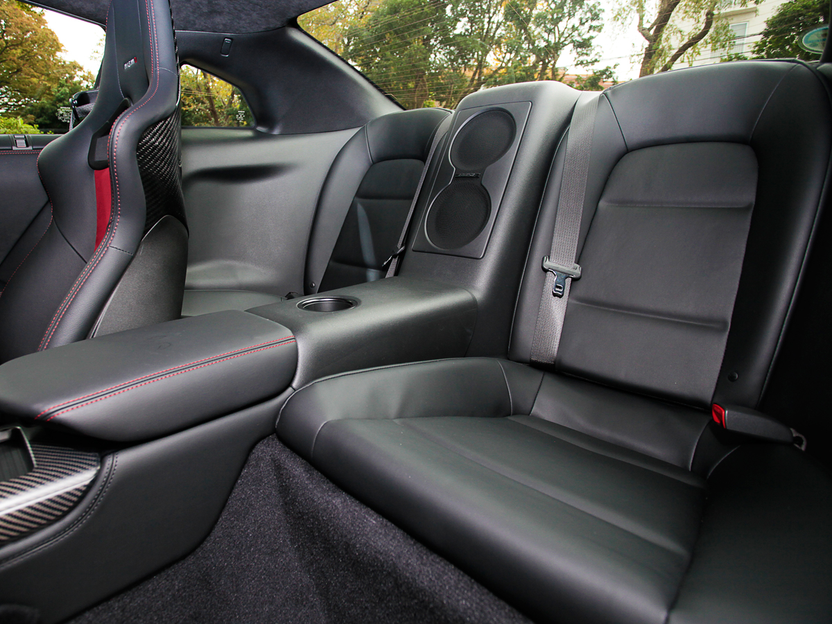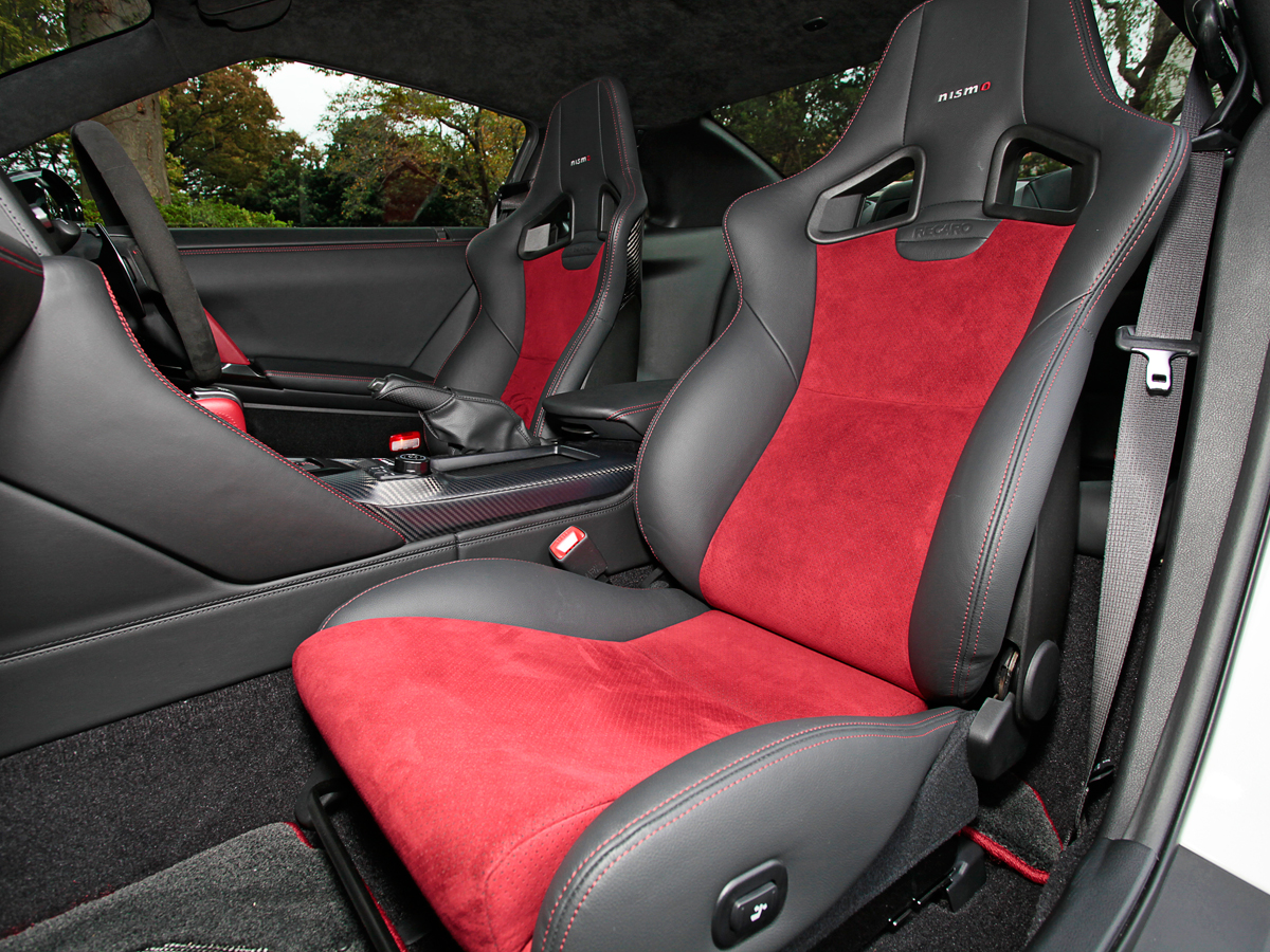 ドアを開ければ、レザーと赤いアルカンタラを用いた、ニスモ専用のレカロ製カーボンバケットシートが迎えてくれます。パッと見、背もたれ、座面とも、サイドサポートの張り出しは控えめですが、しっかり体をホールドしてくれる上、存外クッションが厚くて、座り心地のいいシートです。