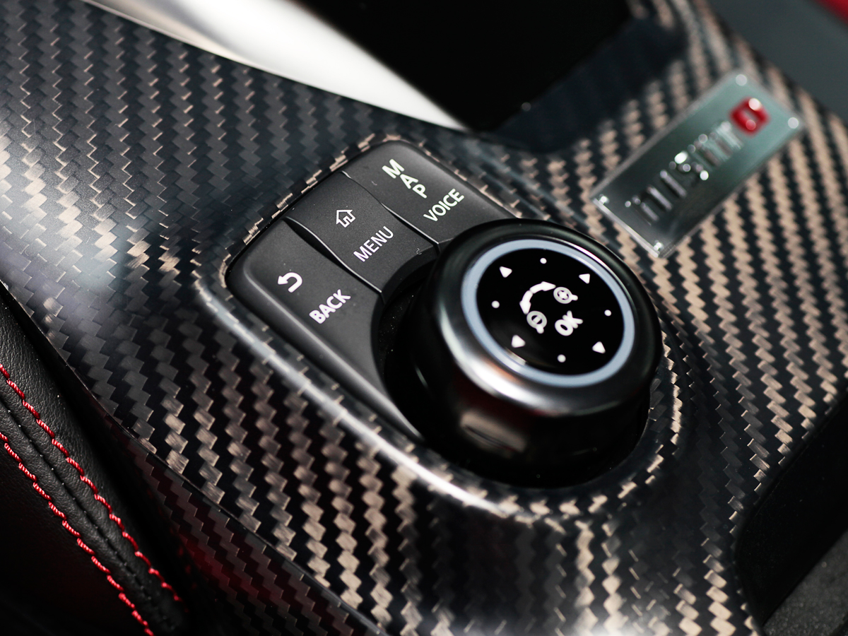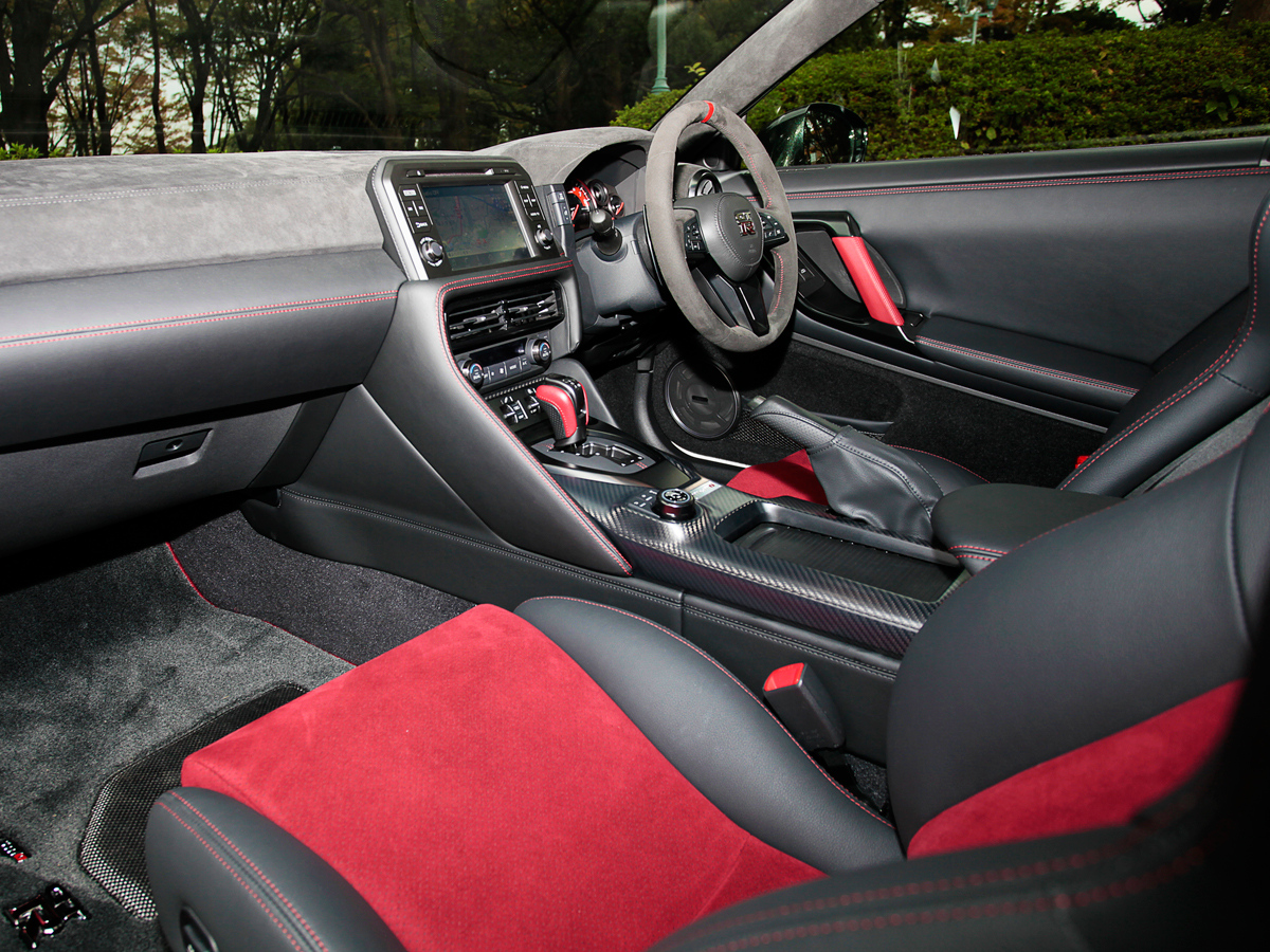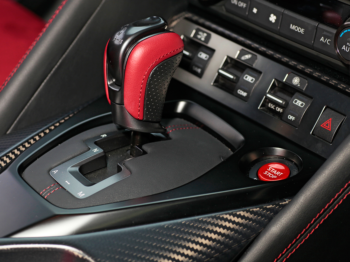 ベーシックな機能改良としては、センターコンソール上部の液晶画面が7インチから8インチに拡大され、トンネル側のカーボン製センターコンソールに、ナビなどを手元で操作する“マルチファンクションスイッチ”が設けられました。また、パドルシフトがステアリングホイールといっしょに回るタイプに変更されたのも、ノーマルGT-Rと同様です。