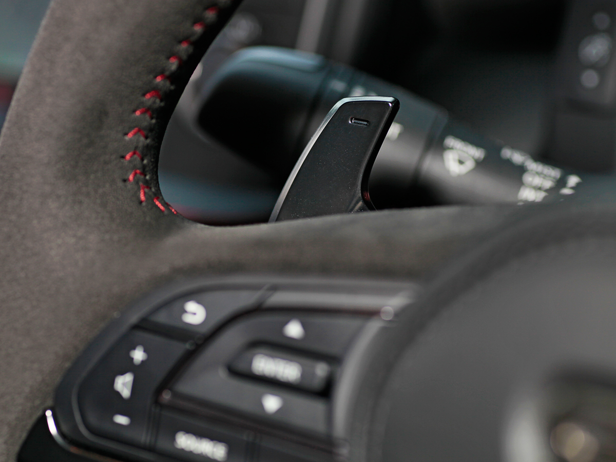 加えて、ステアリングホイール、インストルメントパネル上面、そして、Aピラー内張りから天井にかけて、マットブラックのアルカンタラが貼られます。シックで贅沢な室内ですね! 随所に使われるアクセントカラーの“赤”と呼応して、これまたカッコいいこと!!