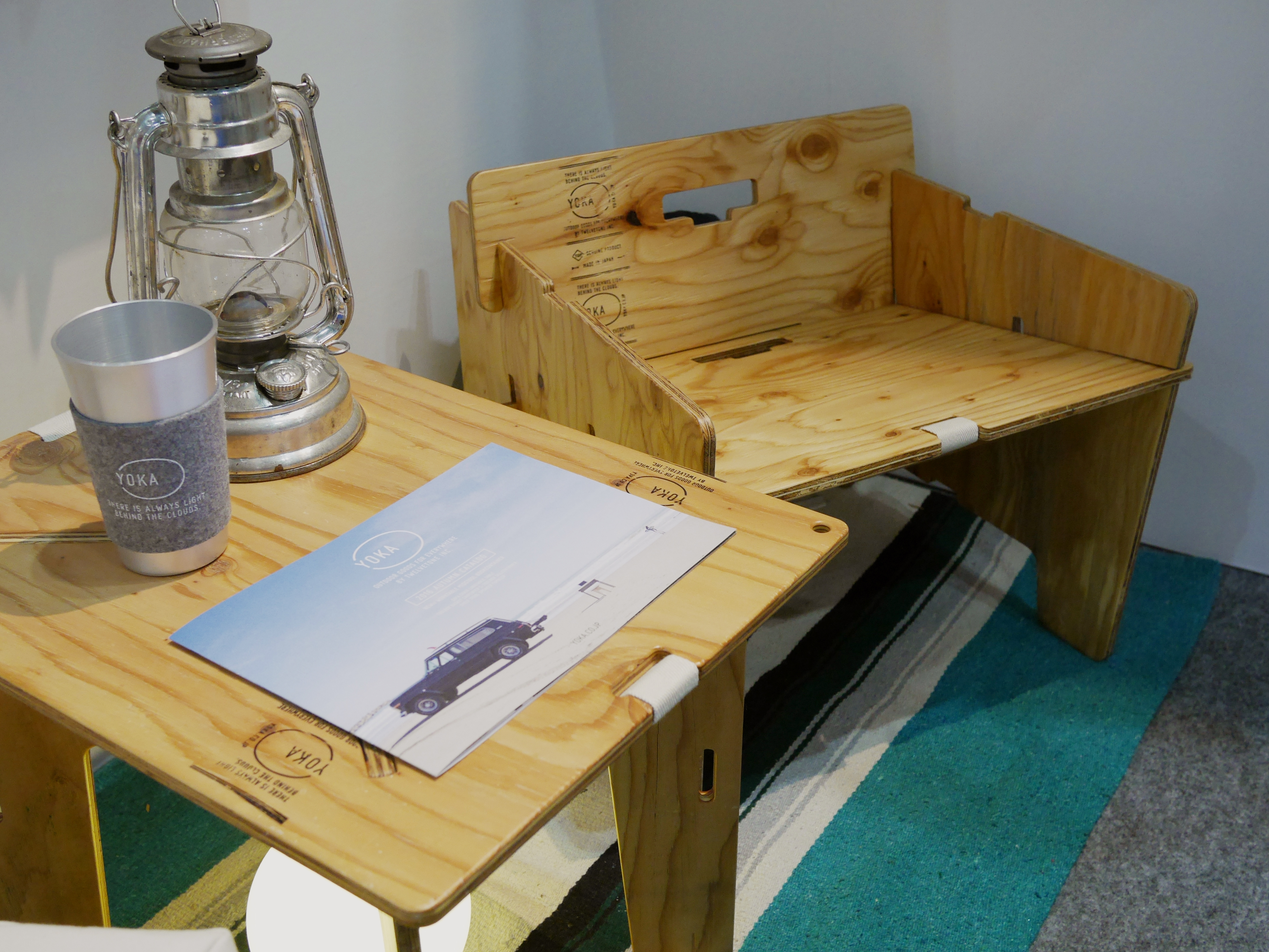 “普段使いできるアウトドアアイテム”というブランドコンセプトにマッチした「PANEL FURNITURE」シリーズ。金属パーツを使用することなく、木の板を組み合わせるだけで椅子や机などのアイテムに変身する。組み立てが非常に簡単なので、移動の際は板の状態で持ち運べば便利。