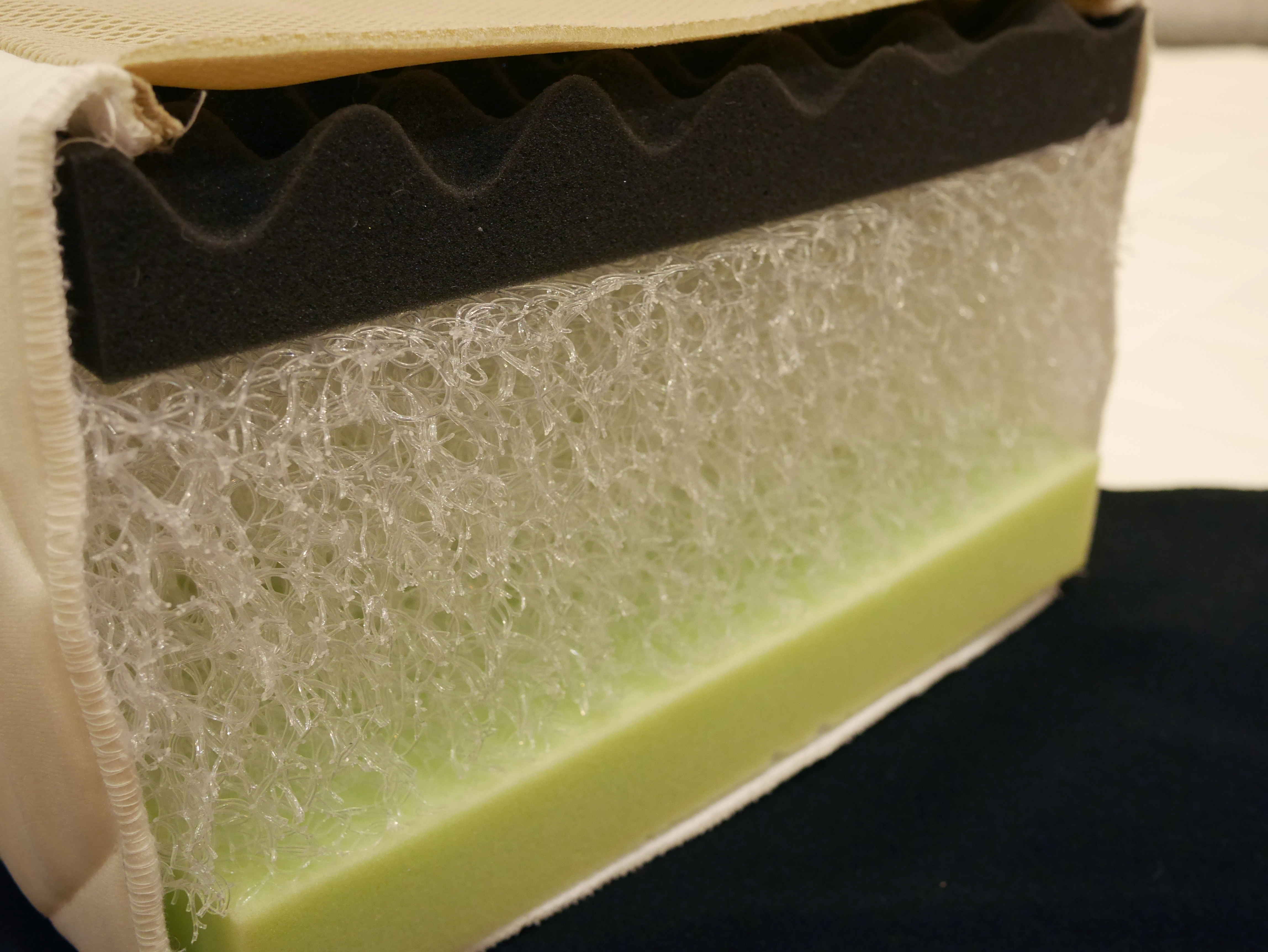 断面画像の中の最も厚い層が、Literie自慢の「ライトウェーブ」と呼ばれる高反発素材のマットレスコアだ。日本有数の家具産地として知られる福岡県大川市で、職人の手により製造されている。どれくらい高反発かというと、思いっきりダイブしたら反発でまた立ち上がれるかも、というぐらいの反発力だ。