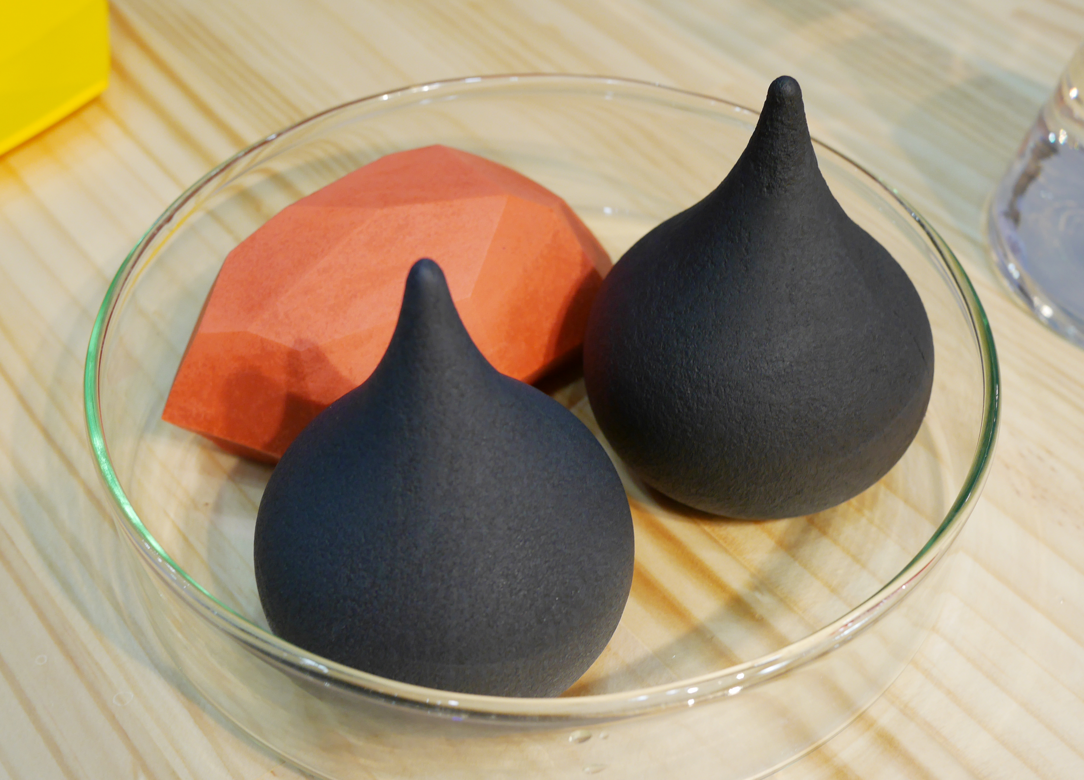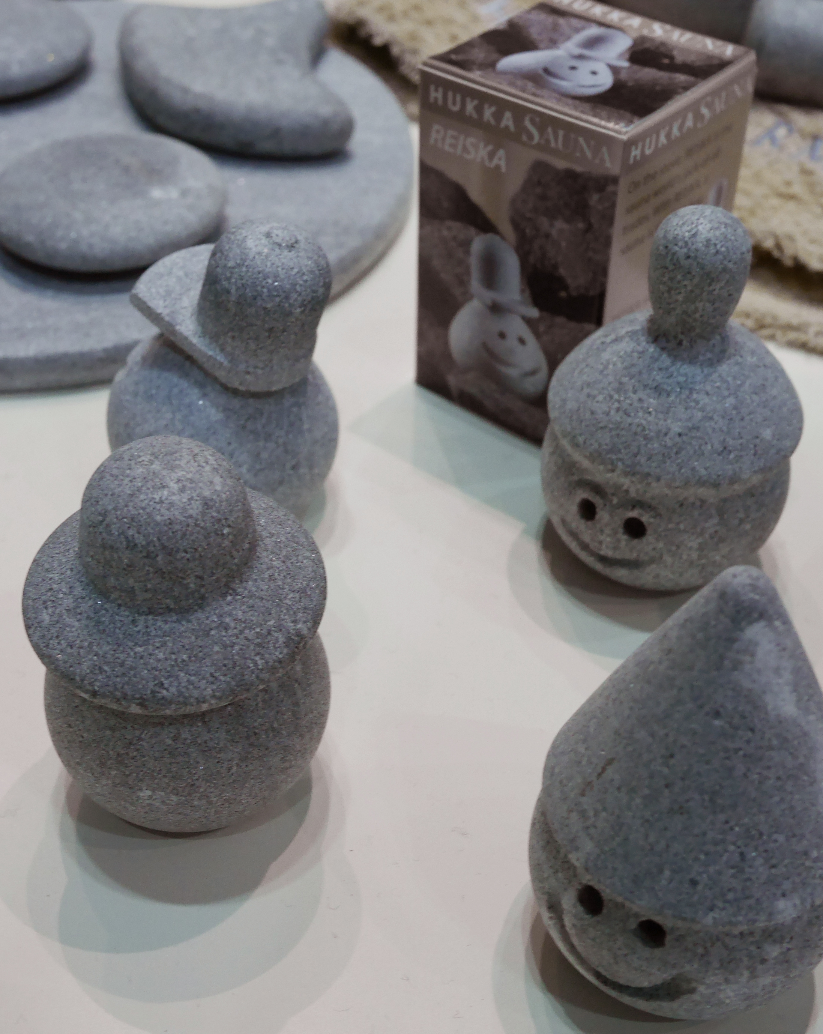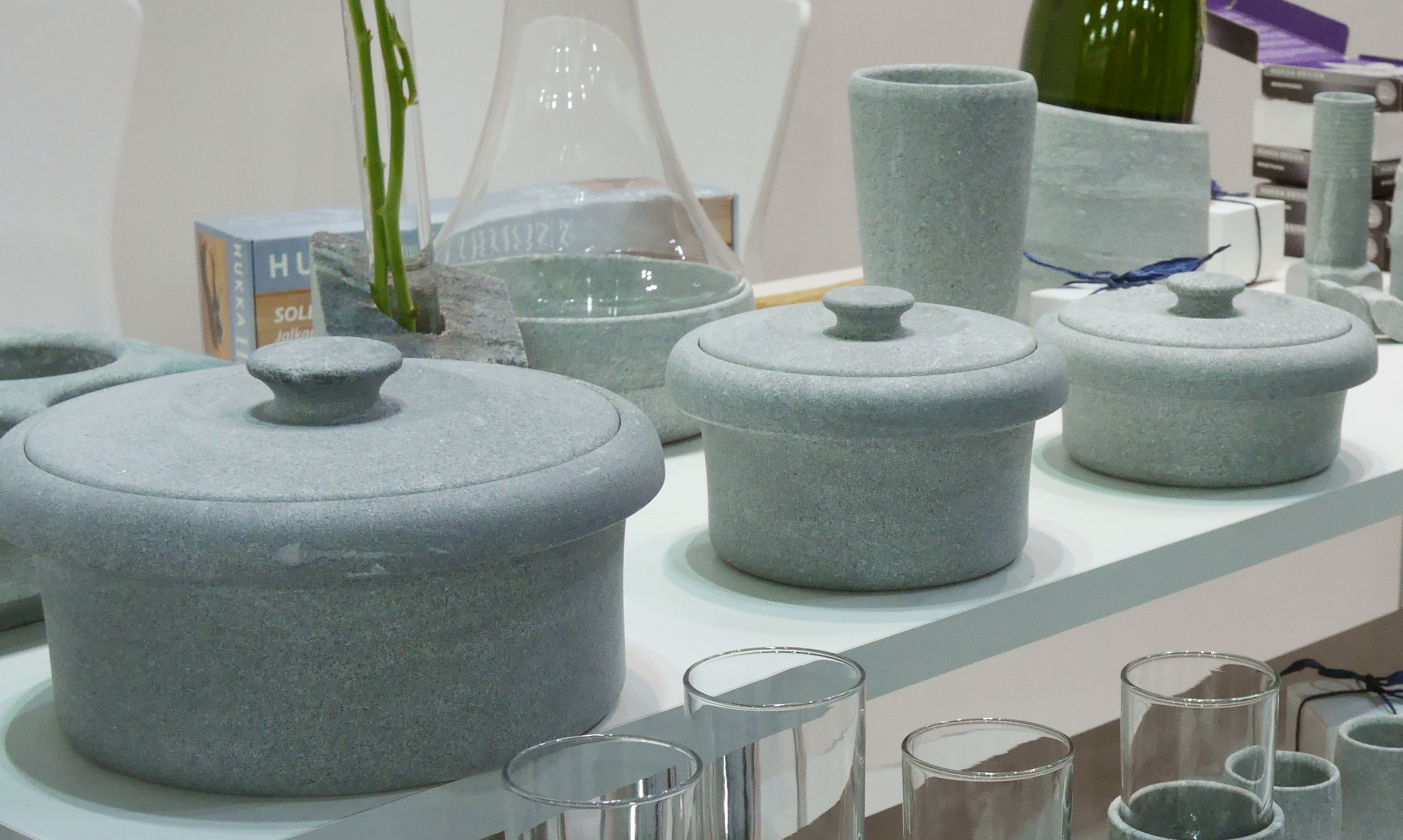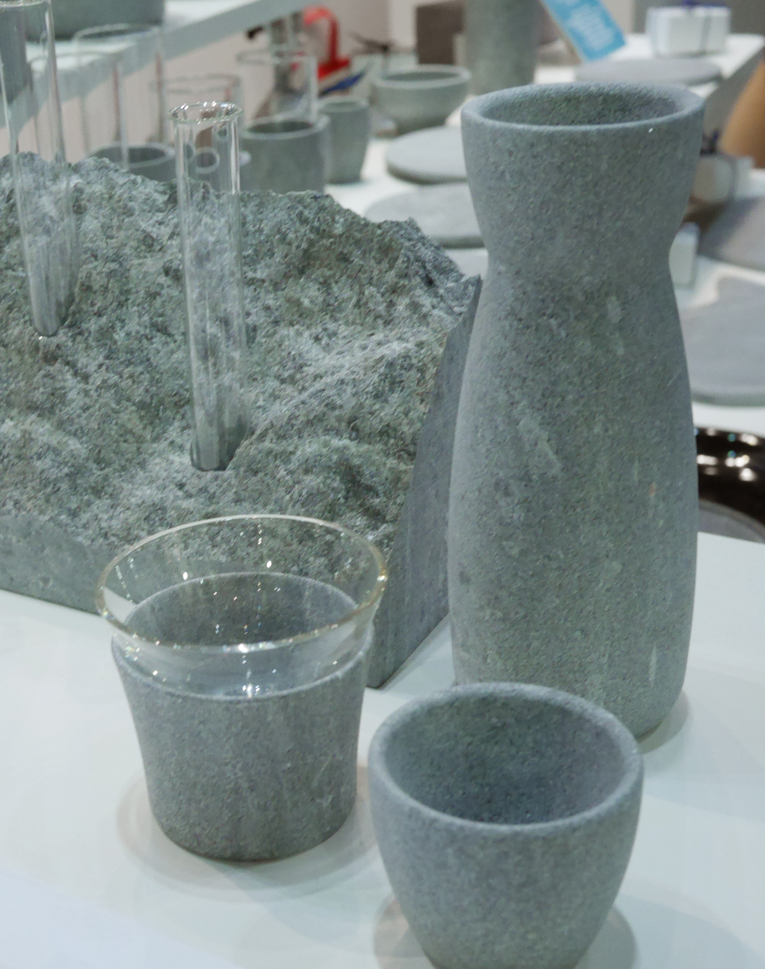 29億年前の地層から掘り出されたという自然鉱石を加工したアイテムが並ぶ。保温・保冷性に優れた素材なので、調理器具や食器に適しているとのこと。産地のフィンランドでは、ツボ押しやコリほぐしに使うマッサージストーンとしても活躍しているらしい。触った感じは瀬戸物に近いが、マグネタイト含有率が高いため強度に優れている。