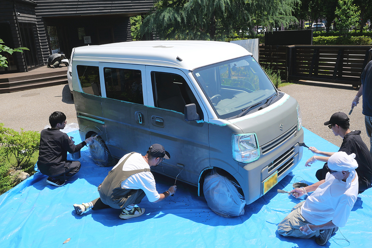 ▲新車で買った愛車のスズキエブリイにマステを貼るヤマケン