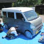▲エブリイのような箱バンは直線基調であるためマステ作業はやりやすい。ただエンブレムや前後ライトなどの塗らない部品は外した方が作業性はいい