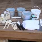 ▲今回用意したタカラ塗料のDIYカーペイントの用品勢揃い。税込総額で2万7870円だった。カラーは「フレンチグレー」を3㎏(税込1万1930円)、水性塗料うすめ液「バランサー」(4750円)、「刷毛塗り全塗装用 刷毛・ローラーセット3人セット」(1万1190円)。このほかダスターやマスキング用ビニール、養生シートなどは別途用意しよう