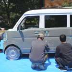 マスキングと足付けがかなりの手間というのが実感だ。今回は窓から下をグレー塗装とし、元のボディ色である白との2トーン仕上げとするが、軽自動車とはいえバンタイプは表面積が大きいし、なにより屋根部分は高所作業となり大変だ。「バンタイプを塗ってみたい!」方、特にビギナーならば、2トーン仕上げを選択肢に入れるといいと思う。