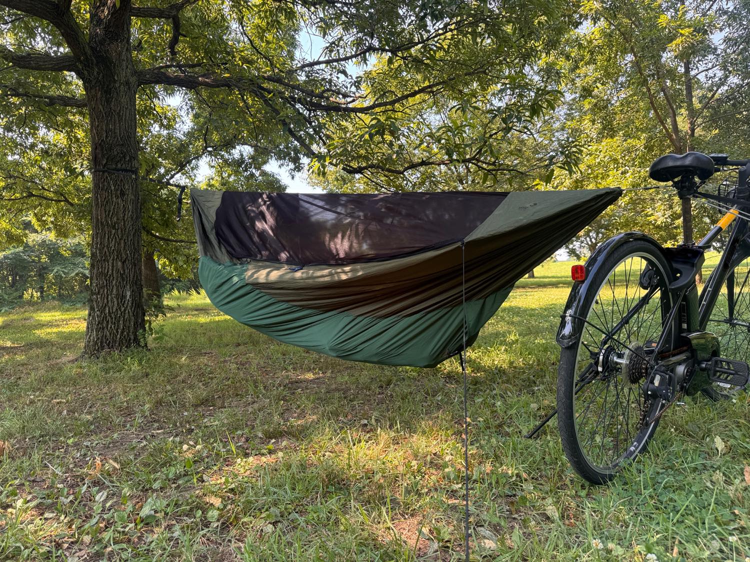 クルマならハンモックスタンドを持ち運ぶという手も使えますが二輪ではそうもいかず、結局ハンモックではなくテントを手に出発するなんてこと、よくあります。
