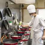 ▲2つのフライパンで同時に餃子を焼いていく。厨房にはずらっとコンロ&フライパンが