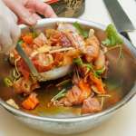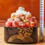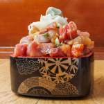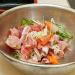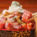 ▲ボウルいっぱいのネタにタレを注いでよくなじませてから酢飯の入った寿司桶に