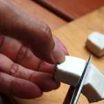 やわらかくて、ナイフでは刃にくっついてきれいな切り口にならないクリームチーズも、底に台紙を残しておけばきれいなダイス形状にカットできました。グルキャンや自宅でおもてなしをするときに活躍しそう。