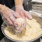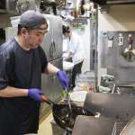 「肉厚レバニラの具は、レバー、ニラ、モヤシ、長ネギですね。最初に刻みニンニクと豆板醤を炒めて香りを出して、そこから具材を炒めて醤油系のタレで味を決めています。チャーハンは逆にゴハンと卵のみで、シンプルに仕上げているんですよ」と話すのは、本社トレーナーの亀岡さん。
