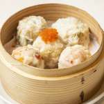 店の看板メニュー「お好きな焼売5個」は、肉焼売、エビ焼売、ホタテ焼売、とびこ焼売、しいたけ焼売の5個。