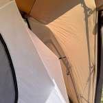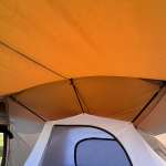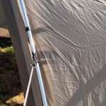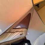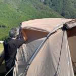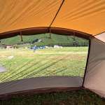 シェルターの後部パネルを巻き上げず、短いポールを使って少し浮かすように跳ね上げれば寝室内が見えにくくなるし、風を取り入れつつ急に降り出した雨が入り込むのを防げます。