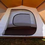インナーテントはワンアクションで開閉できるでっかいドアが2面。後部はシェルターの出入り口とリンクしているので、前後をメッシュパネルにすれば風を取り入れながら眠れます。
