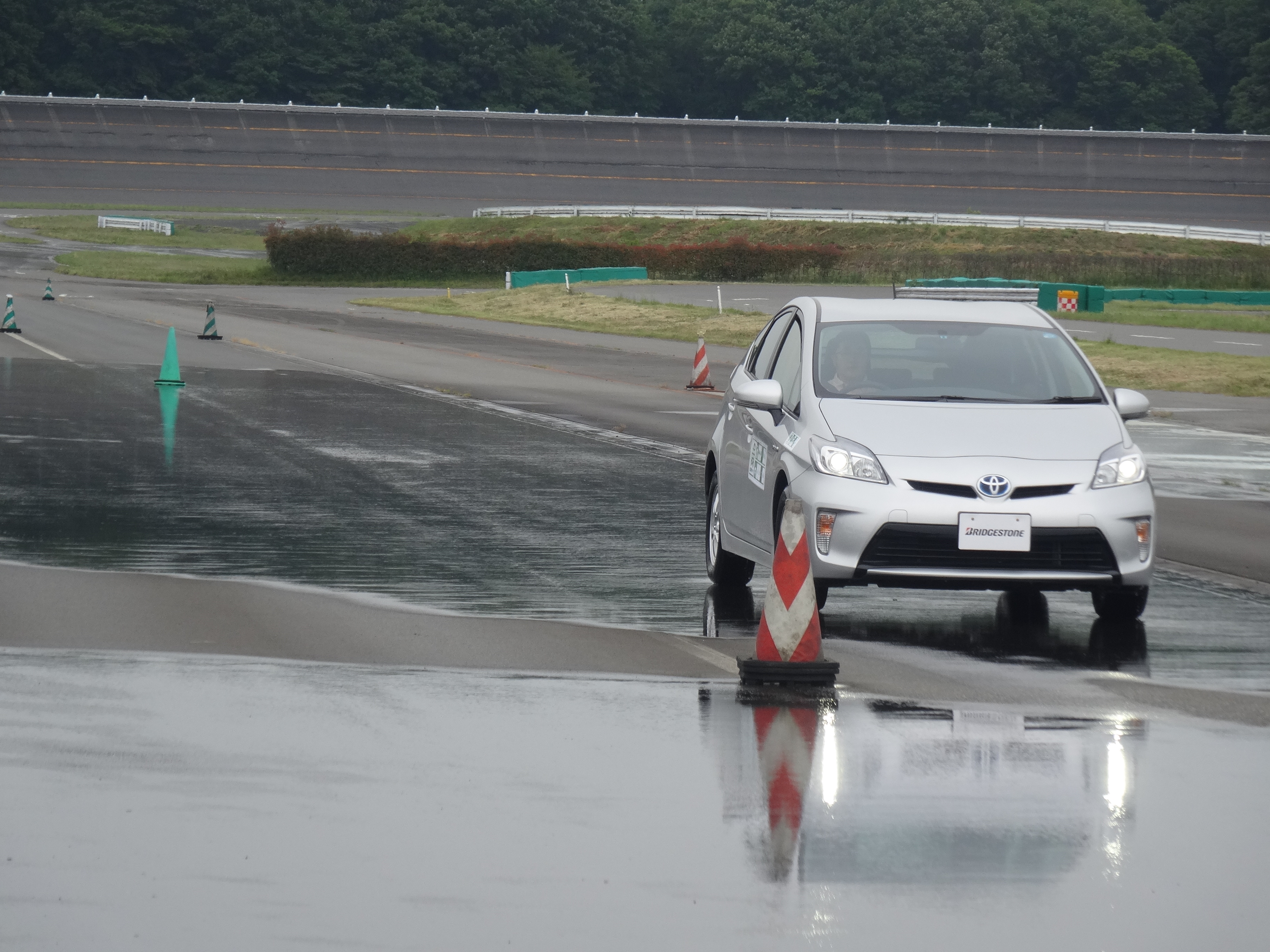 前置きが長くなりました。2台のプリウスで比較するのは、ウエット路面での制動距離。まずは白いプリウス。深さ10mmの水を張った路面で急ブレーキをかけます。