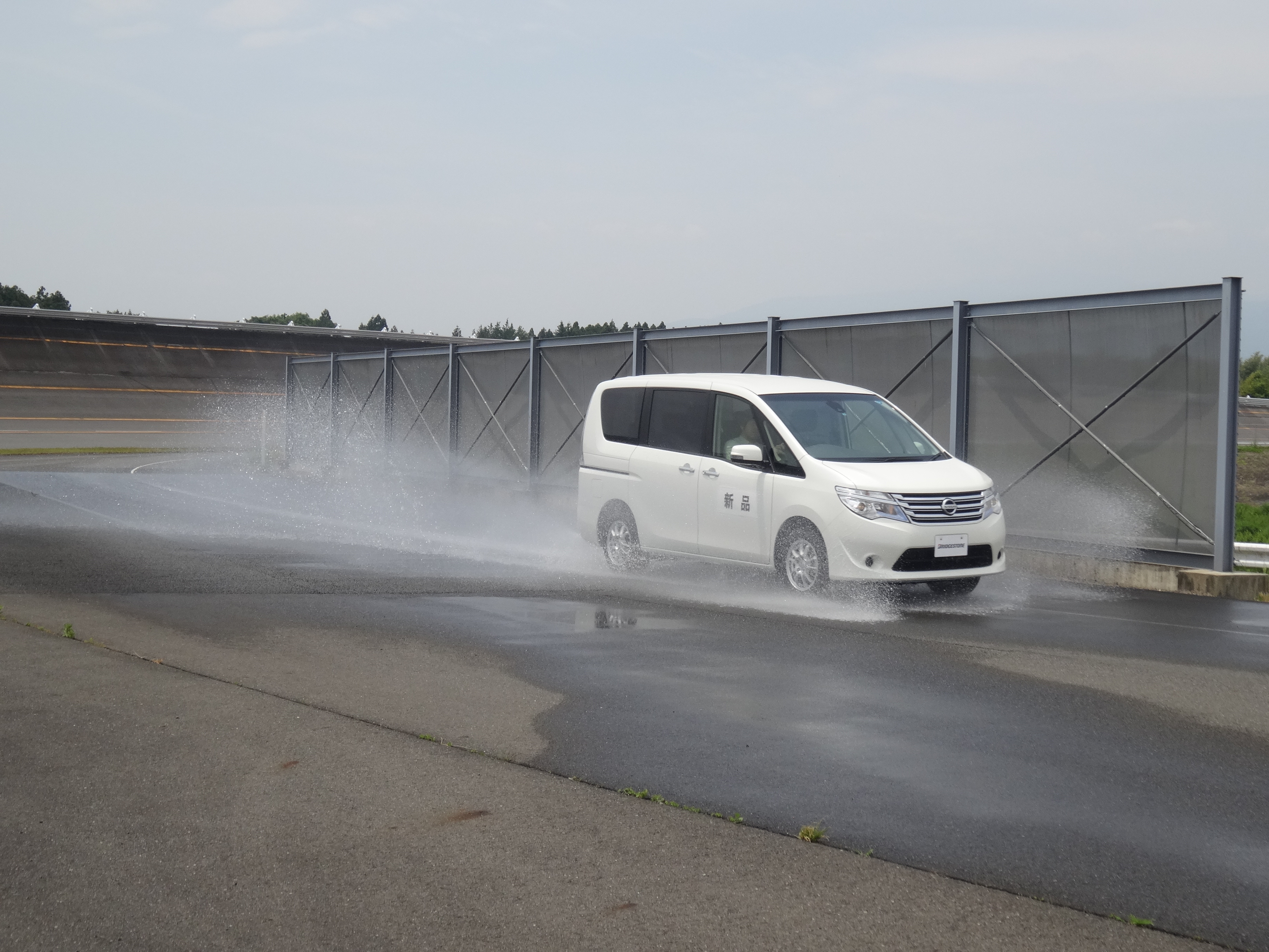 まずは新品タイヤを履いた白いセレナから。コーナーを曲がりながら、ドライ路面からウエット路面へノーブレーキで進入。ヒヤリとする瞬間もなく、ドライバーが意図したとおりのラインに沿って何事もなく走り抜けました。