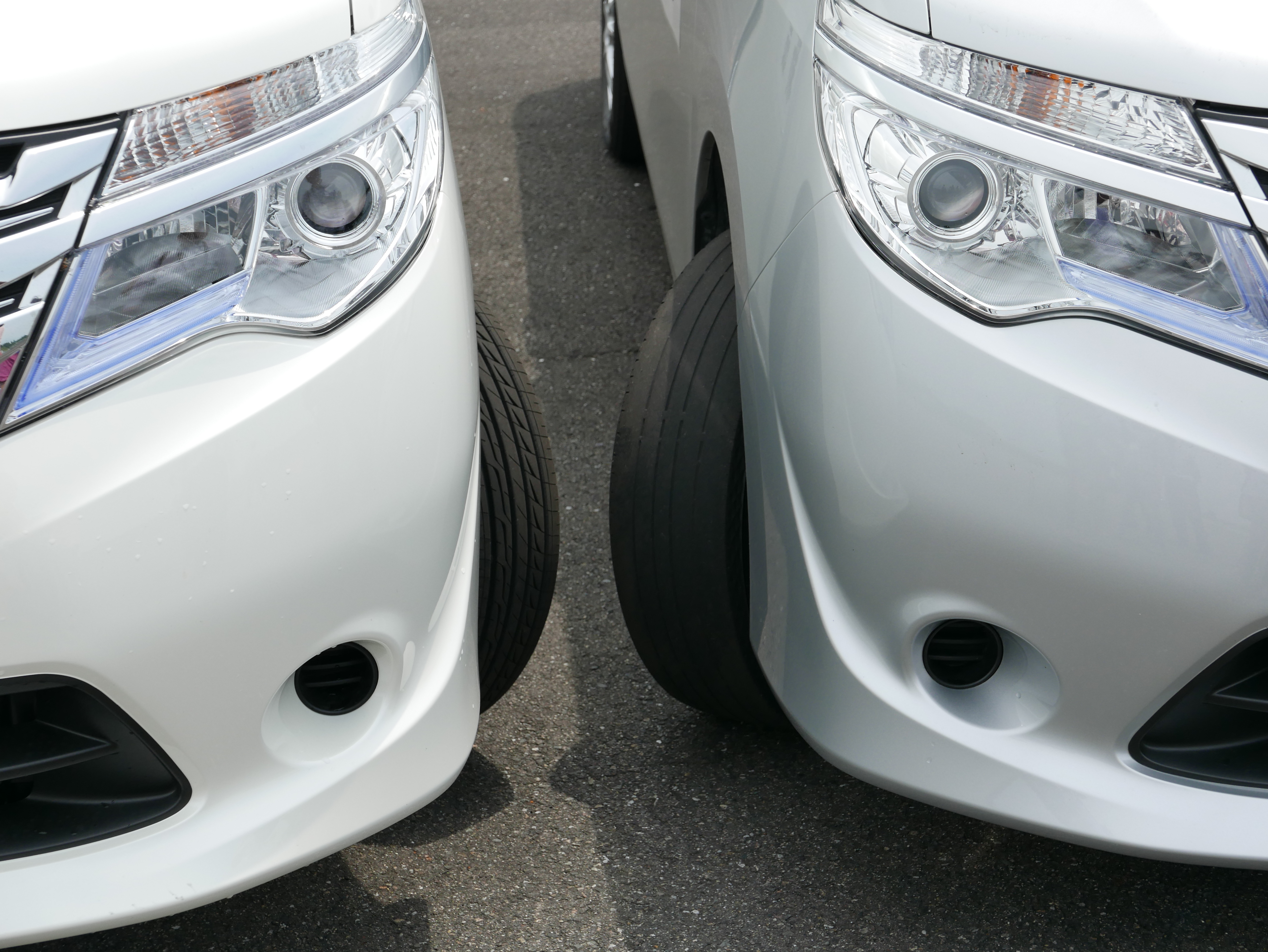 コースには、2台の日産「セレナ」が用意されていました。白い車両は新品タイヤを、もう1台のシルバーは磨耗したタイヤを履いています。磨耗したタイヤは溝がほぼゼロ…。