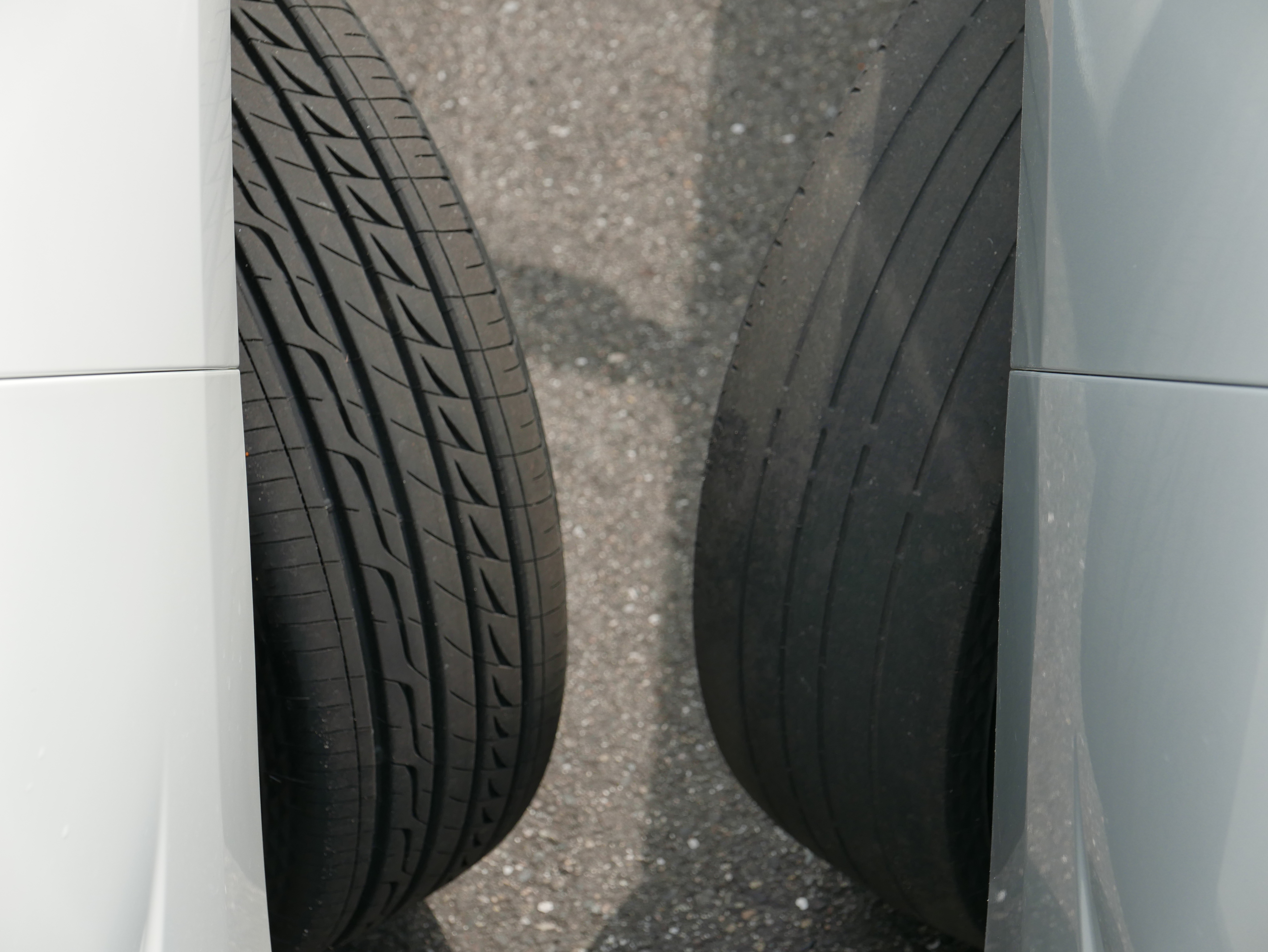 ちなみにタイヤには、転がり抵抗性能とウエットグリップ性能をグレーディング(等級制度)する仕組みがあり、ラベリング性能といっています。このラベリング制度でいえば、白いプリウスが履くタイヤは、転がり抵抗性能が「AAA」でウエット性能が「a」。シルバーのプリウスが履くタイヤは、転がり抵抗性能が「A」でウエット性能が「c」のものでした。