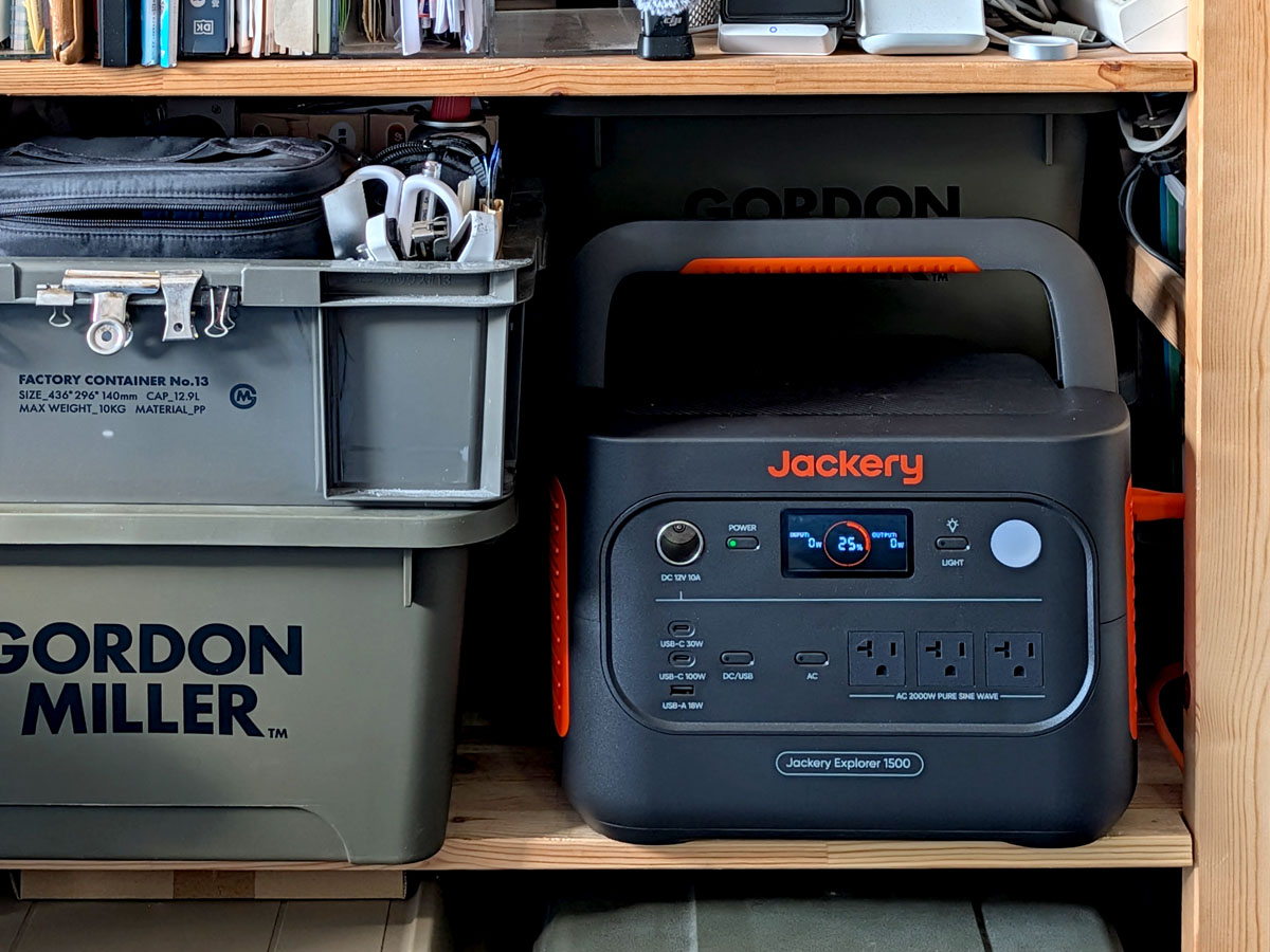 ごちゃごちゃするモノは収納ボックスに入れているんですが、幸い(?)なことに、そのボックスがミリタリーライクなため、少々アウトドアな雰囲気のあるジャクリのポタ電とは好相性。