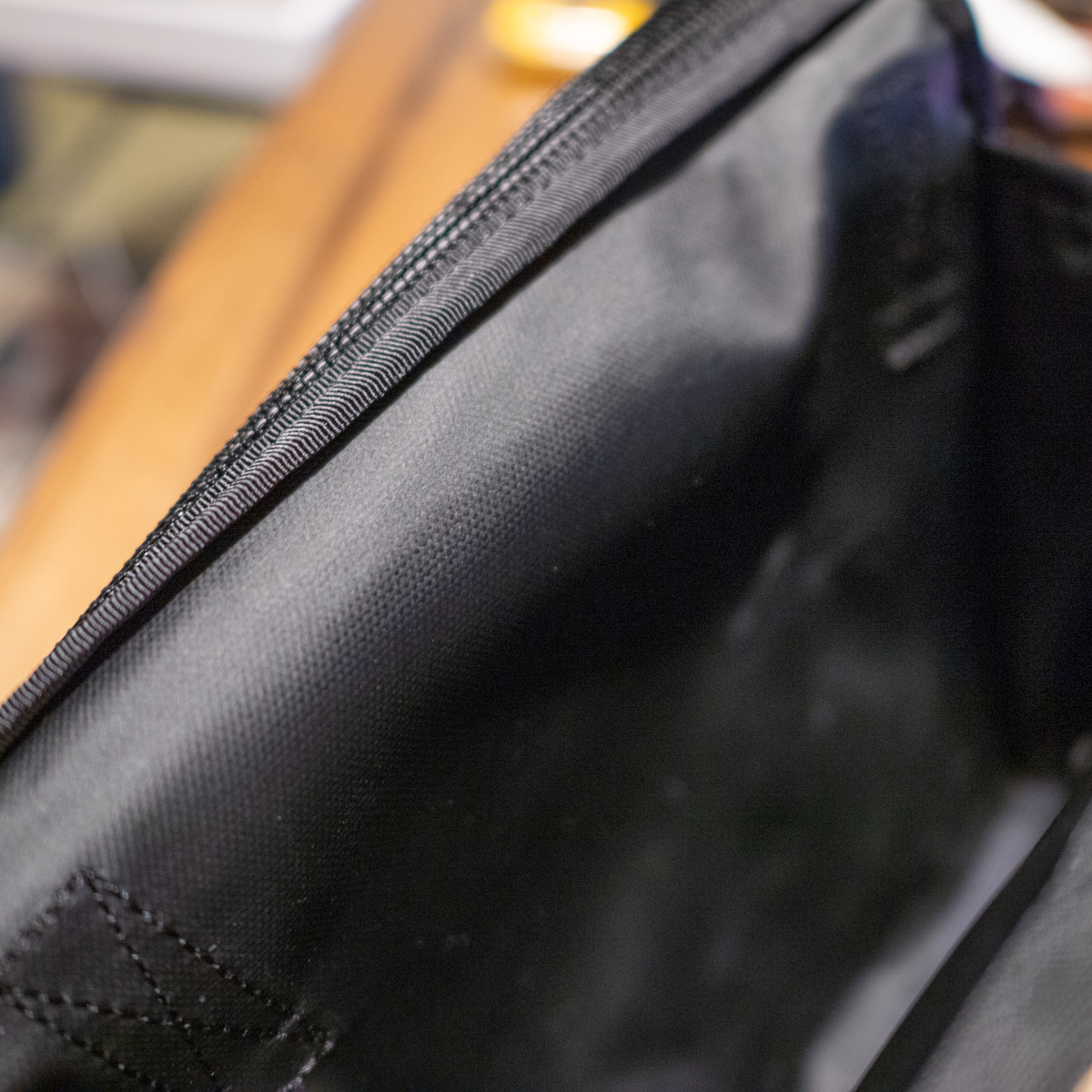 もともとはキャンプでの使用を想定されたギアバッグなので、タフな生地感が特徴的。600デニールリサイクルポリエステルTPEラミネートファブリックを採用しており、耐水性と耐久性にしっかり配慮された作りなので、日常づかいには十分安心できます。防水仕様ではありませんが、この耐水性素材の採用はちょっとした雨の日でも安心です。
