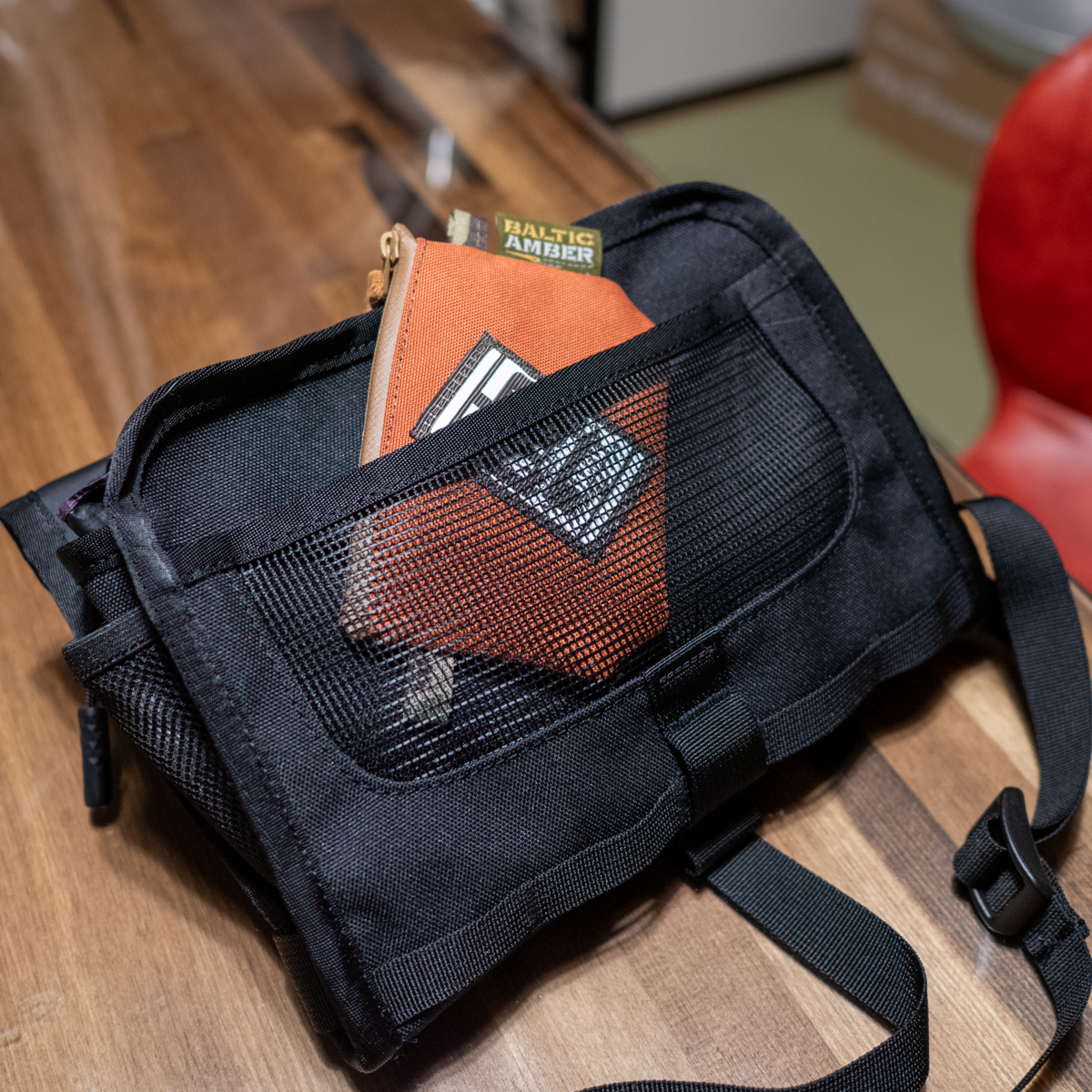 続いて、メインコンパートメントの前面にはファスナーなしのメッシュポケットも。マチはありませんが、キャッシュレス派ならカードケースを入れておくのにちょうどいいサイズ感です。