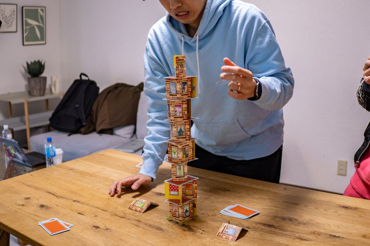 基本は、屋根カードの指示どおりにカードを置きつつ、タワーを崩さないよう慎重に積み上げていくだけ。
