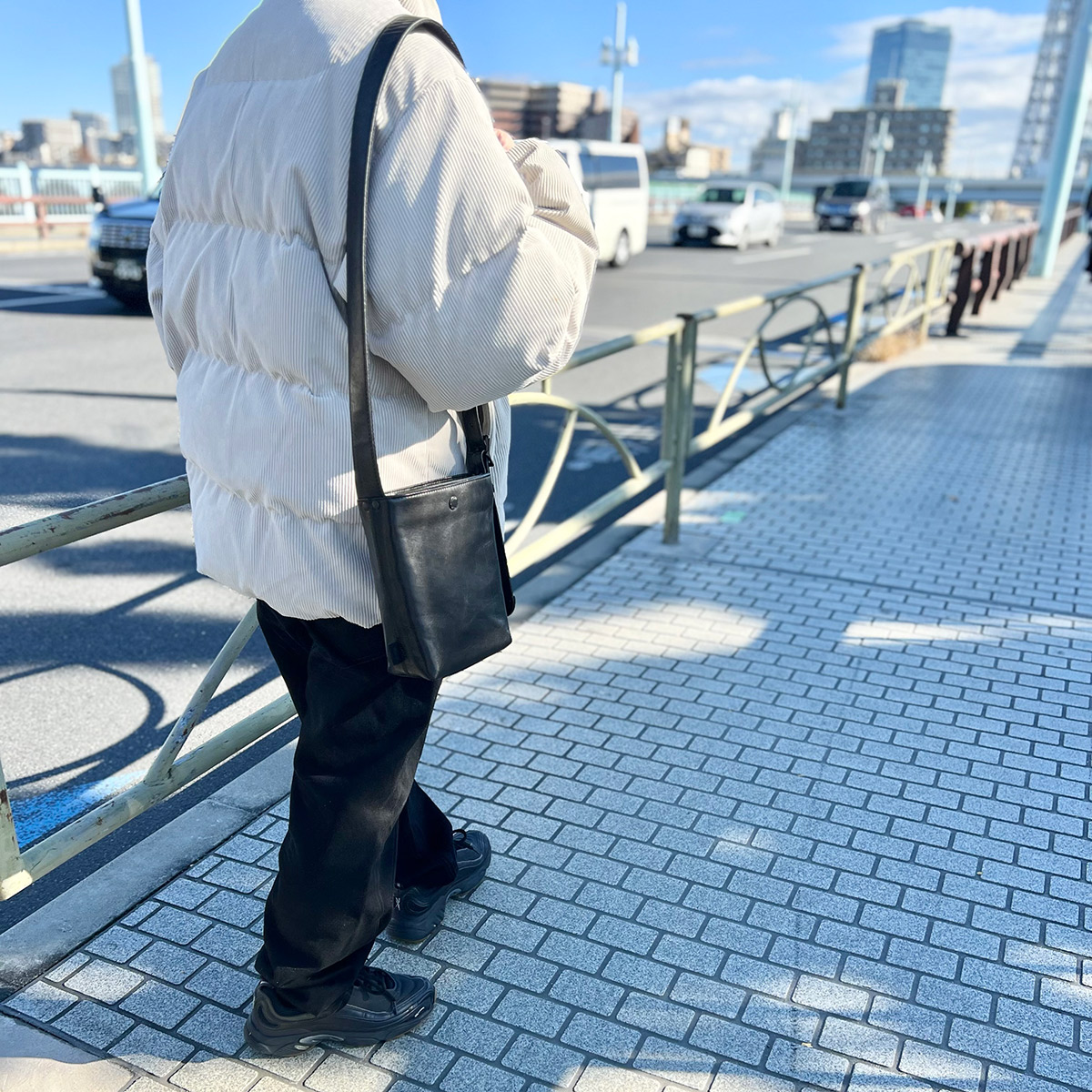 ご覧の通り、ミニマルなルックスはどんな着こなしにもマッチ。細部に至るまでブラックで統一しているのもポイントです。今まではナイロン製などのカジュアルな印象のショルダーバッグを使用することが多かったのですが、普段カジュアルな着こなしが多いためそれだと若干ラフになりすぎてしまうなとぼんやりと思っていました。むしろ、カジュアルな服装にレザーバッグなど落ち着いたアイテムを合わせてメリハリを利かせたいと考えていただけに展示会でひと目見たときから頭から離れず、発売されてすぐに購入するほど理想のバッグだったのです。