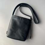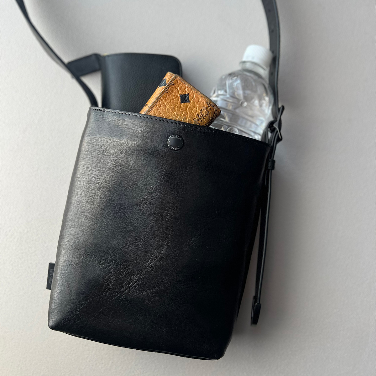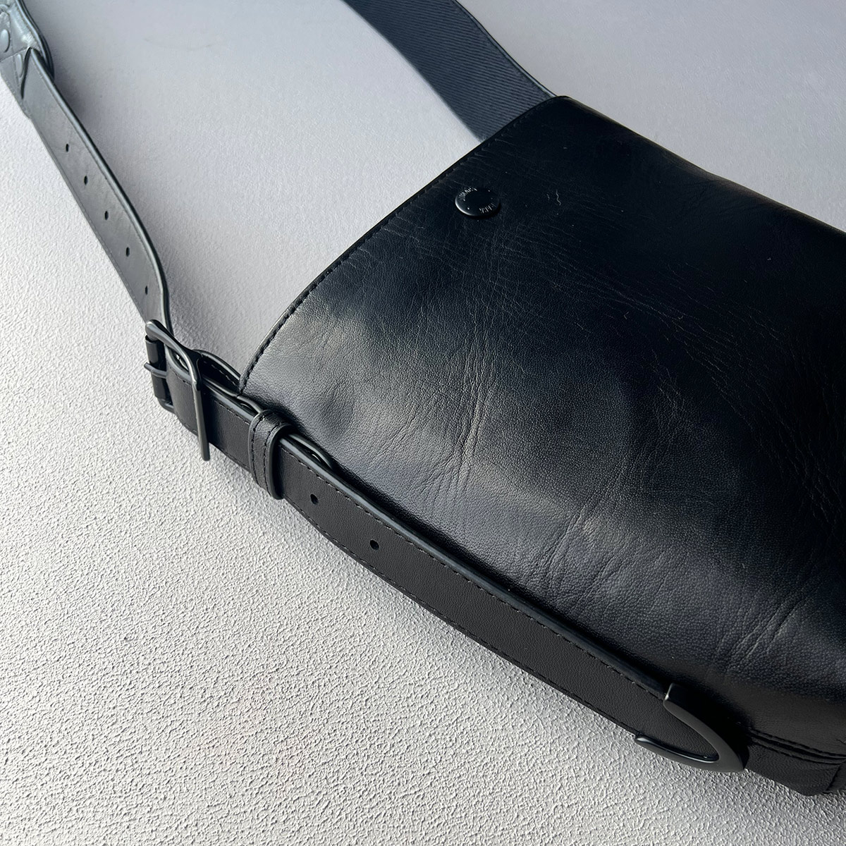さらにこのバッグ、細部を見ても完璧なんです。いや、細部までも見事に作られているから完璧なのでしょう。ストラップは長さを調節できるのですが、そのバックルやベルト剣先のあしらいなども同色ブラックの金属で作られていて非常にクールな表情。意外と世に出ている多くのレザーショルダーは金属部分がシルバーで、それだと少しレディスのような雰囲気になってしまいがち。あまり気付かれないところではありますが、金属もブラックということは大人の男性においてとても重要な要素なのです。
