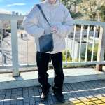 バッグ自体の容量は2L。休日、外に出かけるときは財布とキーケース、ペットボトルくらいしか持ち歩かないのですが、その3つが本当にちょうど良く収まります。基本的に荷物はコンパクトにしたいというのもありますし、何よりちょこんとしたサイズのレザーバッグが可愛いんですよね。オフィシャルのサイズはH21×W20×D7cmとなっています。背負うと見た目以上に持ちやすく感じると思います。