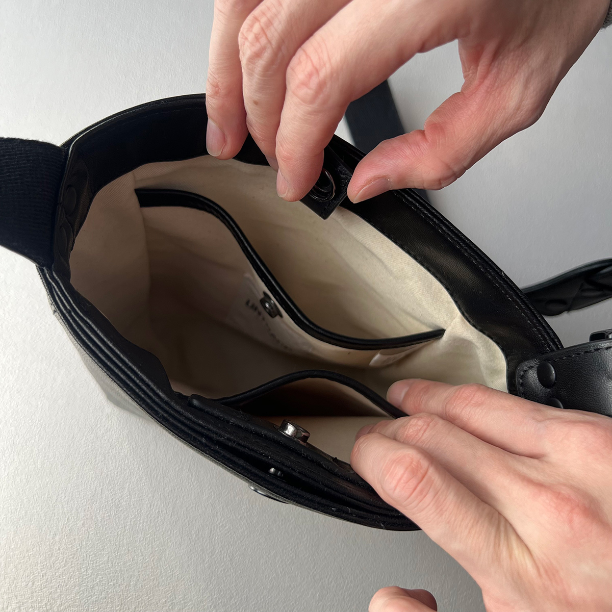 また、よく見るとフロント側に隠しポケット的なもうひとつ荷室が。ここはやや浅めのポケットになっていて、スマートフォンやリップクリームなど頻繁に出し入れするようなアイテムを入れるのにうってつけです。