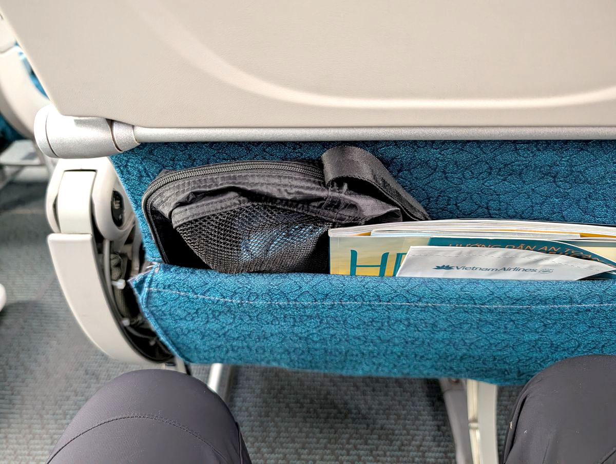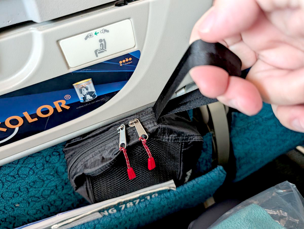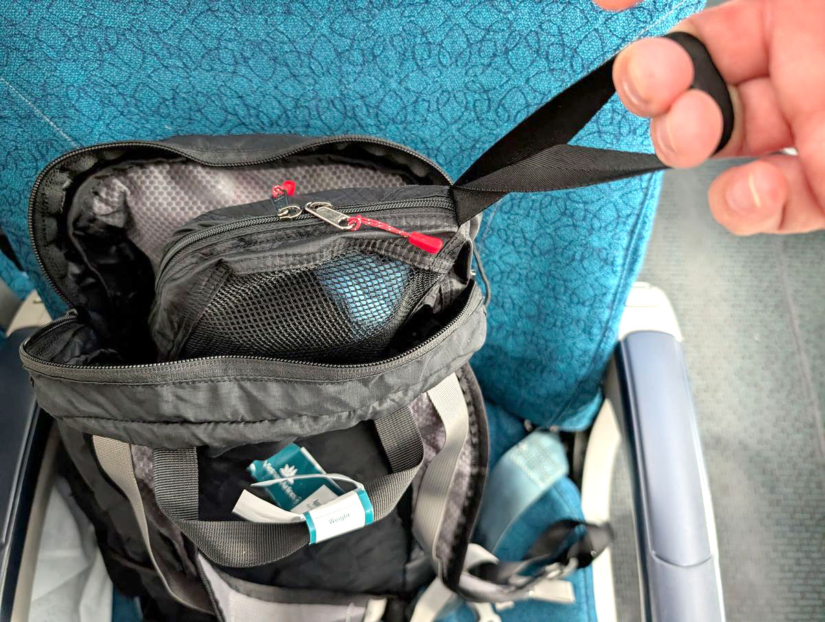 自分の座席に到着して、機内持ち込みリュックから取り出す際も、座席前のポケットから取り出す際も、この持ち手があると本当に便利。