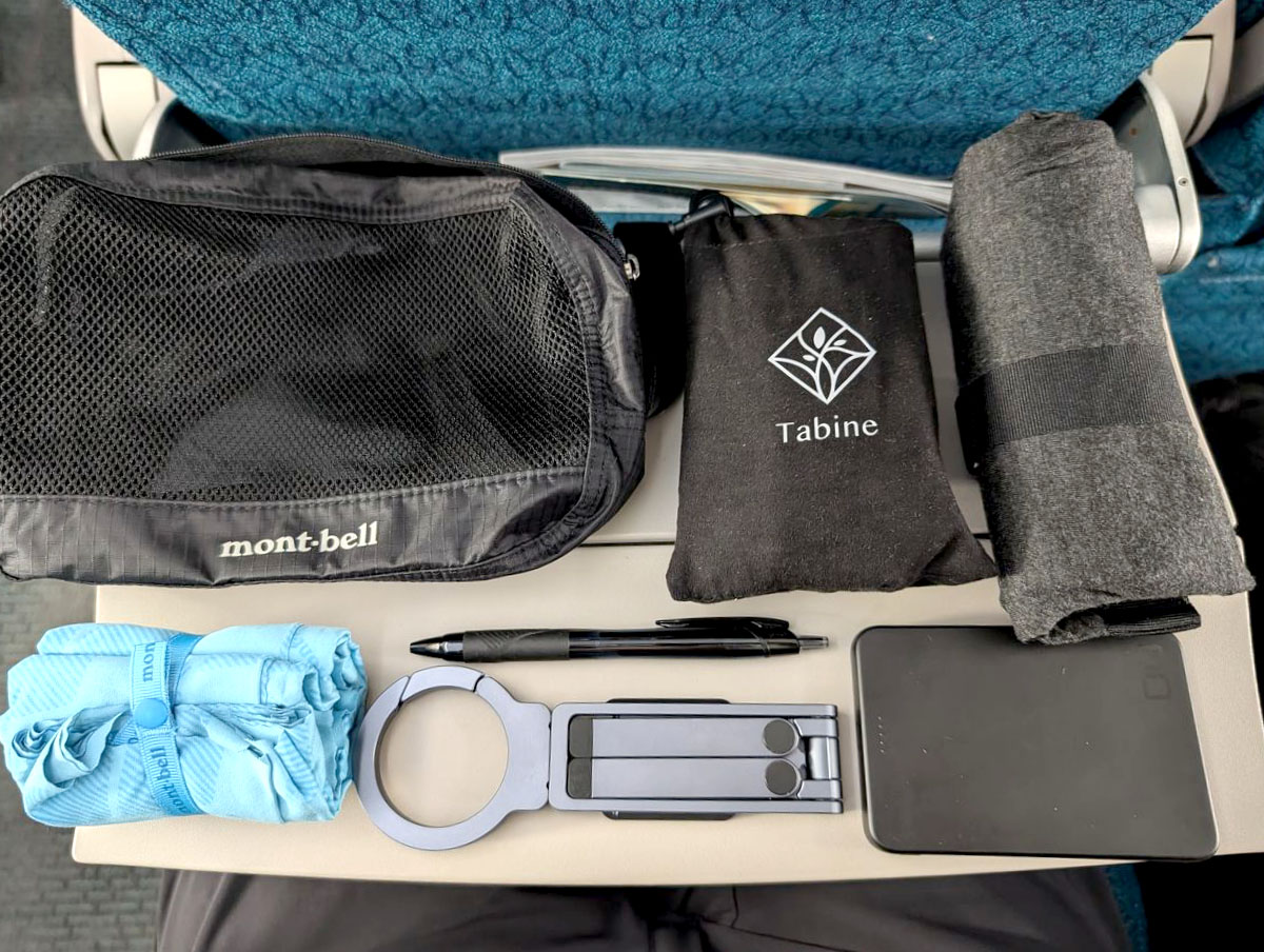 想像以上にたくさん入ります。モバイルバッテリーに関しては、最近は発火の危険性があることから“見えるところに置いて使用しない”が飛行機内でのルールになっています。