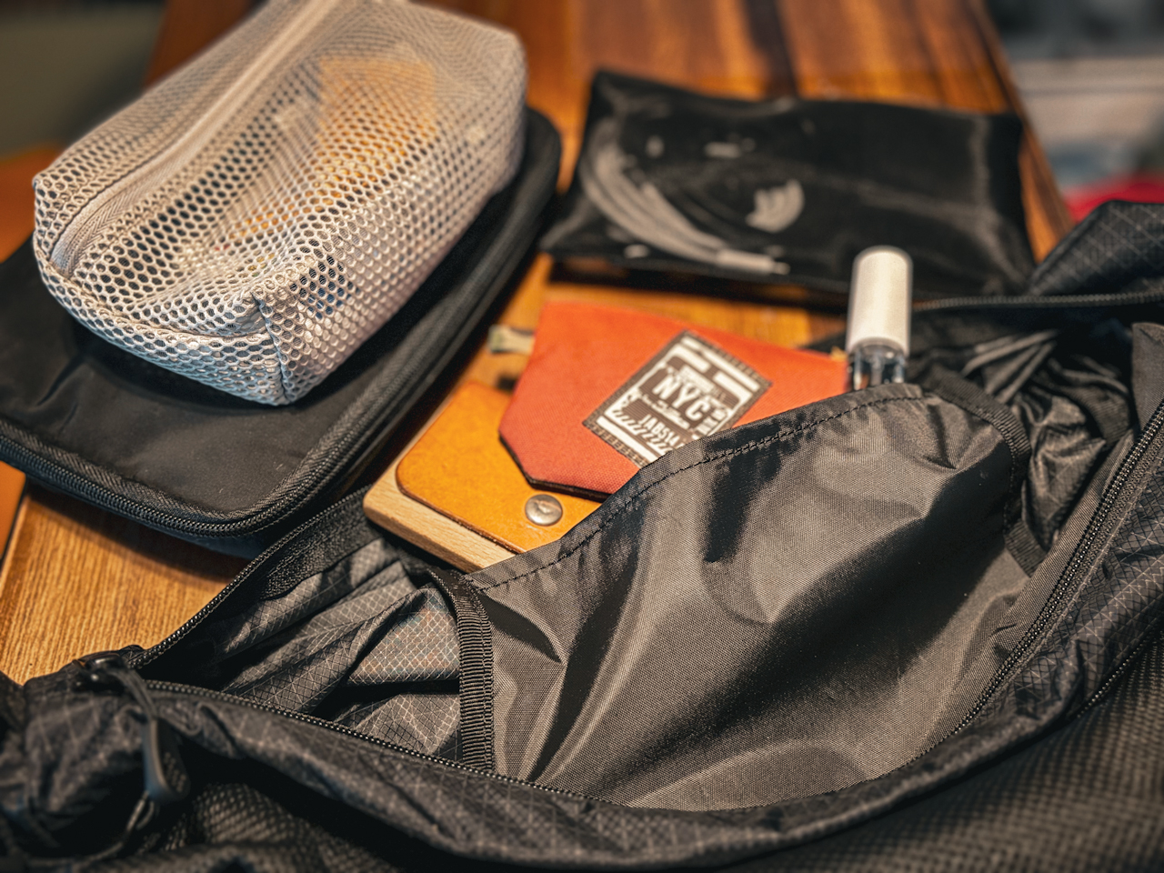 まず収納に関して見ていきますが、大きなメインコンパートメントに、背面のメッシュポケットとかなりシンプル。一応メインには小物用のポケットが付いていますが、荷室が細かく分かれていないので、1つのバッグだけで日々をこなす人にはイマイチです。定位置を作れませんからね。なので、基本はバッグインバッグで中身を整理する使い方が良さそう。その辺は自分のスタイルに合わせて検討すれば良いのかなと。