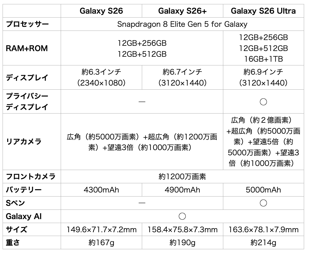 ▲左からGalaxy S26、Galaxy S26+、Galaxy S26 Ultra