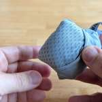 もうひとつの特徴が、半分開いた状態で使えること。ハンカチ本体に付けられた袋に収納するのですが、この袋を半分だけひっくり返すと、ハンカチが外側に出てきます。その状態でも使えるというわけです。
