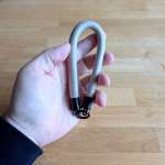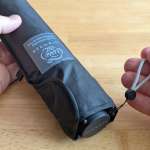 元々ストラップが付いていましたが、これがやたら小さい。折りたたみ傘って、使った直後にたたんで持ち歩く時、びしょびしょで袋に入れたくなかったりしませんか? だからストラップを巻いて親骨を縮めただけの状態で持ち歩くことがよくあるんですが、そういう時にこの小さなストラップだと持ちづらかったんです。